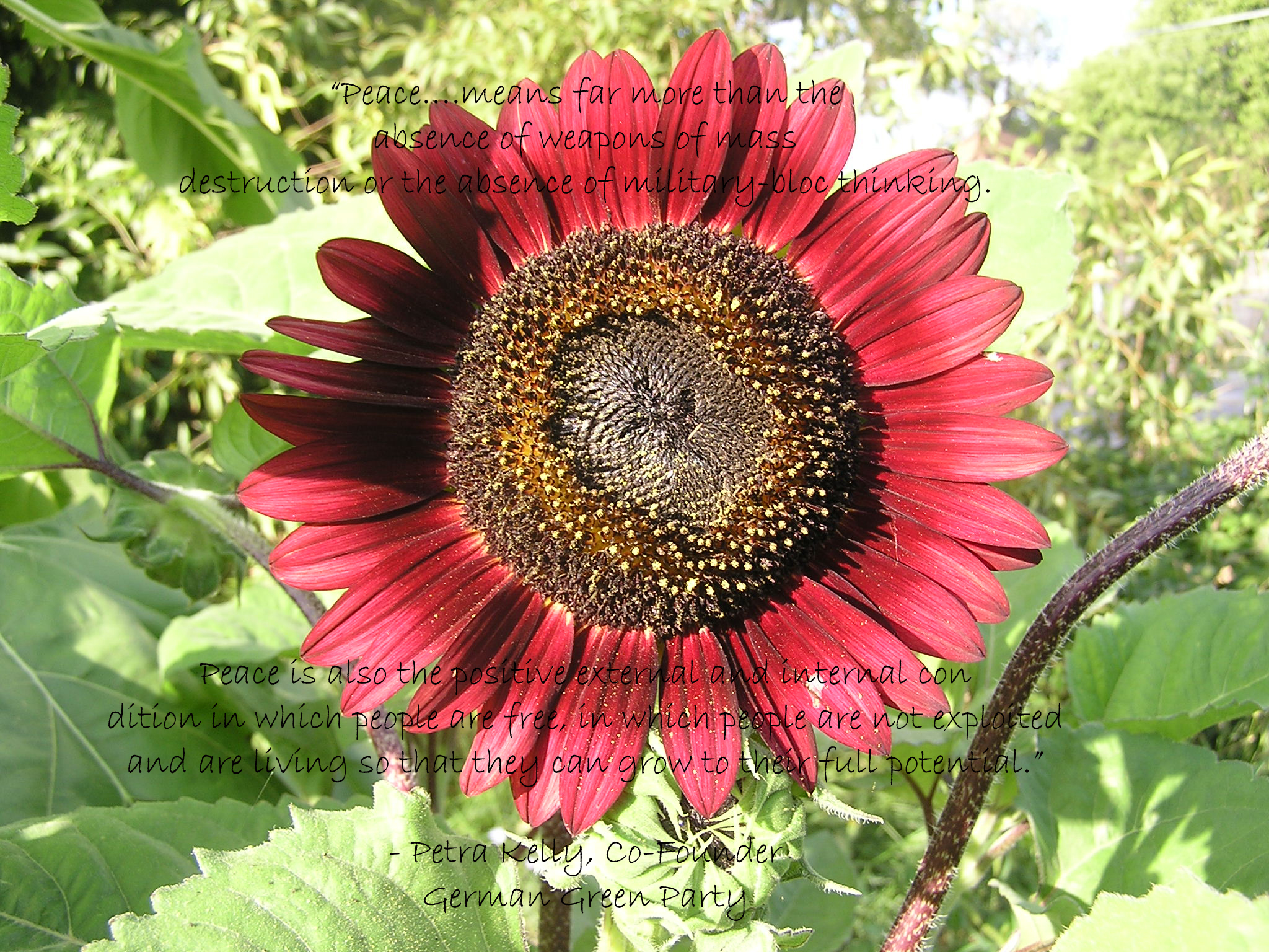 Sunflowers have become the symbol of a world free of nuclear weapons. After Ukraine gave up its last nuclear warhead, the Defense Ministers of the U.S., Russia, and Ukraine met on a former Ukrainian missile base, June 4, 1996. They celebrated by scattering sunflower seeds and planting sunflowers. Former U.S. Secretary of Defense William Perry said, “Sunflowers instead of missiles in the soil would insure peace for future generations. Read more about the sunflower at: Sunflower.