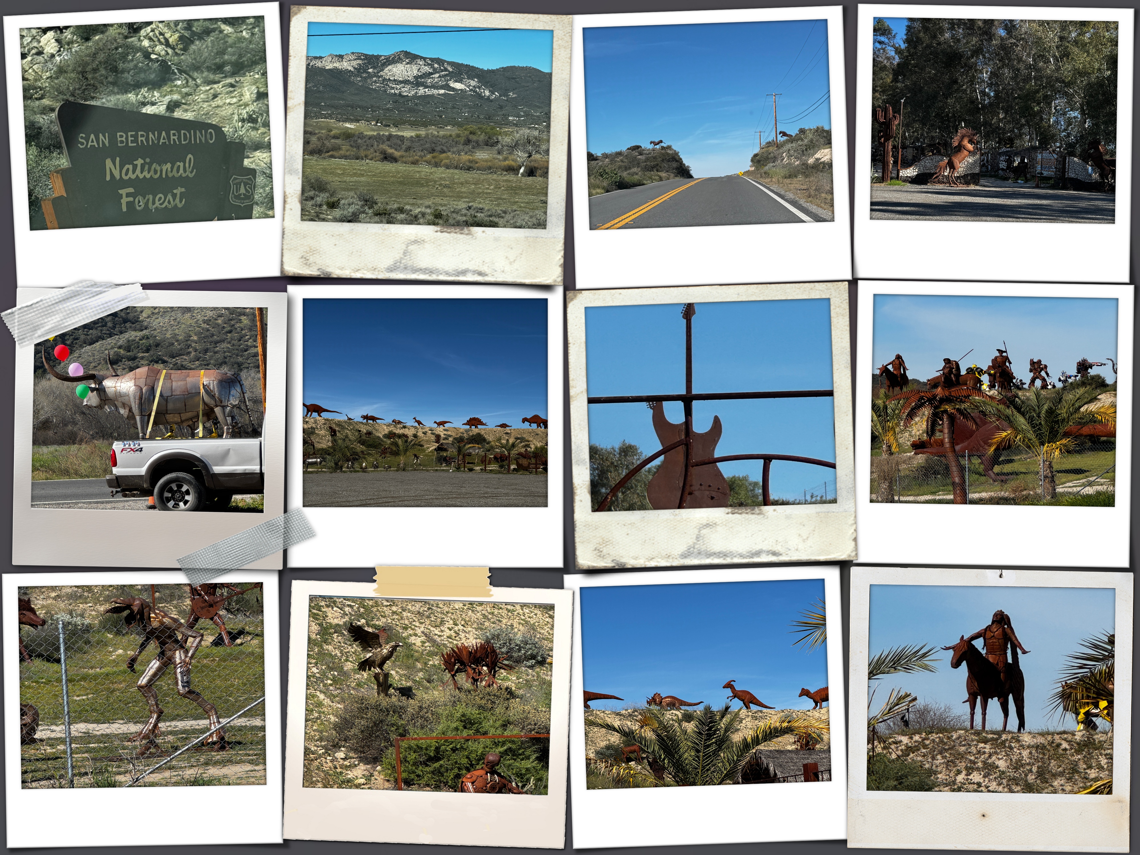 Our Valentines Day journey from the desert to the ocean on the Pines to Palms Scenic Highway (CA Road 74) then led us through the San Bernardino National Forest to the outdoor gallery of metal sculptures in Aguana, CA by artist Ricardo Breceda – The “Accidental Artist”. We were greeted at first just before the gallery by metal horses atop two hills flanking the road. Visitors can view these magnificent sculptures from the parking lot , ranging from animals to people, to characters from movies, to musical instruments. A nominal fee gets you into the gallery to walk amongst the art. (We did not go in due to time constraints.) You can view the artist’s website here: https://ricardoabreceda.com/ (read his personal story on the “about” tab).
