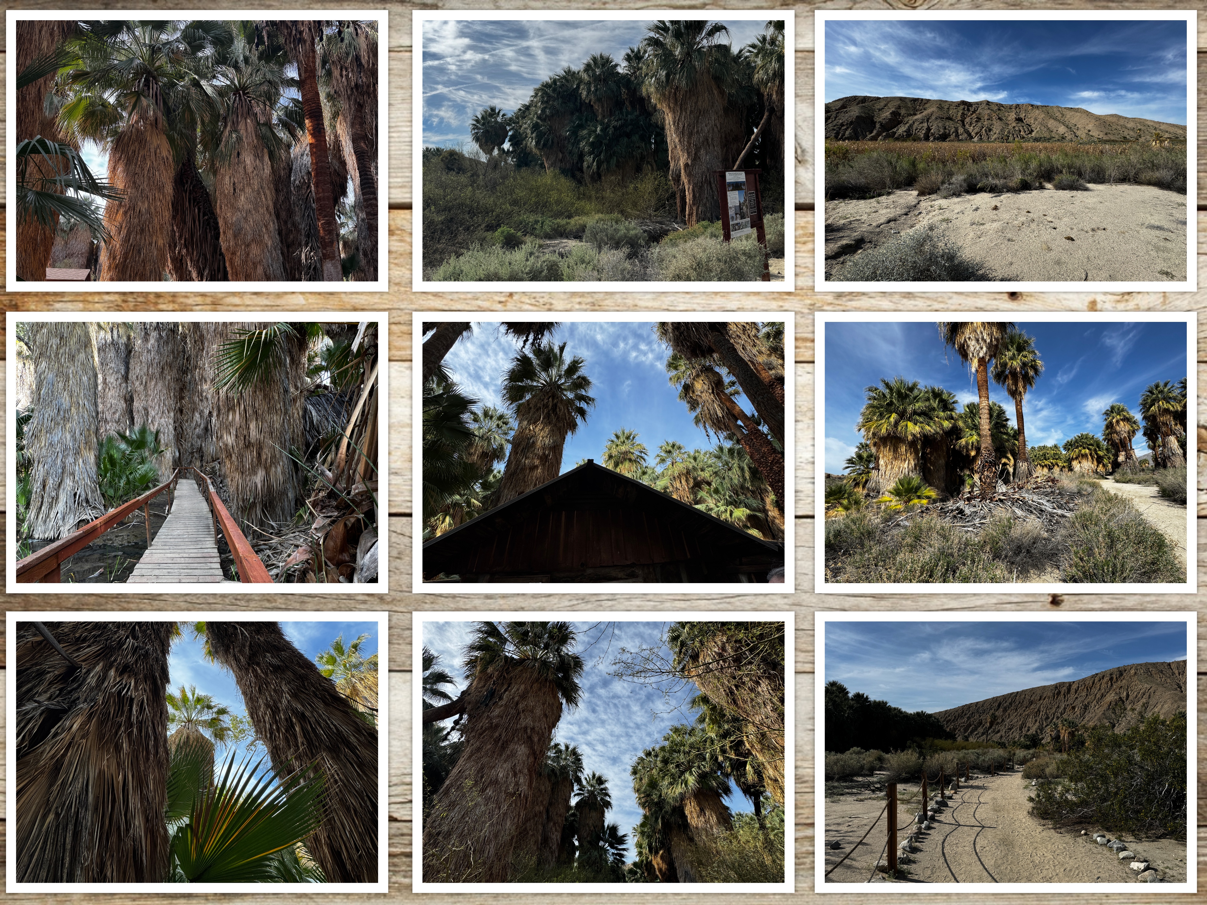 Coachella Valley Preserve System (https://en.wikipedia.org/wiki/Coachella_Valley_Preserve). The palm trees here are native and in their natural state. The palm oases are formed by the San Andreas Fault, which pushes underground water to the surface, creating pockets of life in the landscape of the arid desert.